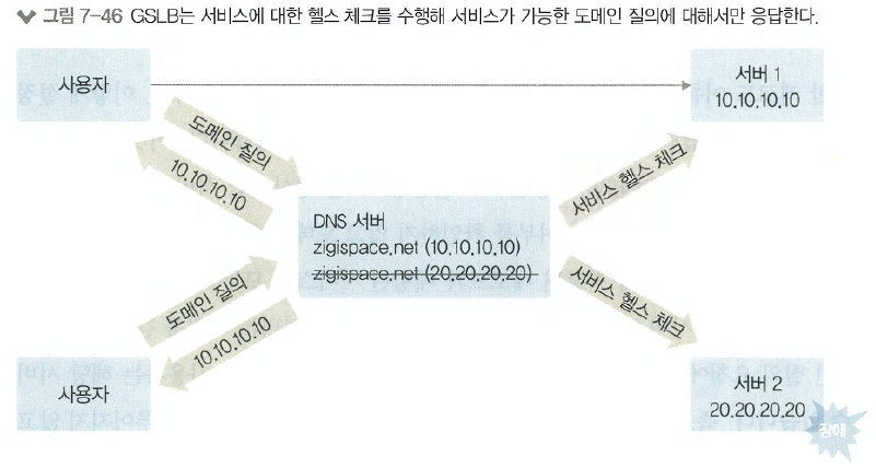 GSLB(Gl.obal Server/Service Load Balancing)는 DNS의 이런 문제점을 해결해 도메인을 이용한 로드 밸런싱 구현을 도와줍니다. GSLB는 DNS와 동일하게 도메인 질의에 응답해주는 역할과 동시에 로드 밸런서처럼 등록된 도메인에 연결된 서비스가 정상적인지 헬스 체크를 수행합니다. 즉,등록 된 도메인에 대한 서비스가 정상인지 상태를 체크해 정상인 레코드에 대해서만 사용합니다. 그림 7-46을 보면 그림 7-45와 달리 서버 2가 장애로 서비스가 불가능할 때 GSLB에서는 등록된 두 개의 레코드 중 서버 2의 IP 주소를 가진 레코드를 도메인 질의에 대한 응답으로 사용하지 않도록 잠시 내리게 됩니다. 따라서 zigispace.net을 질의한 사용자는 모두 정상적으로 서비스되는 서버 1의 IP 주소만 응답받습니다.