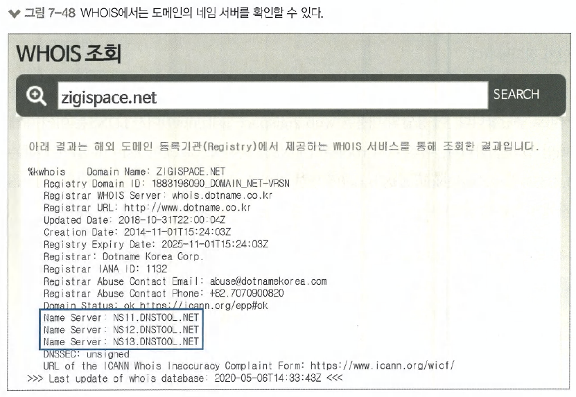 이 경우에는 도메 인의 레코드 중 헬스 체크 기능이 불필요한 경우뿐만 아니 라 모든 레코드에 대한 질의가 GSLB를 통해 이루어지므로 GSLB에 부하를 주게 됩니다. 그림 7_48은 도메인 구입 시 설정한 네임 서버 정보를 조회한 예시입니다. GSLB를 도메인의 네임 서버로 지정하면 네임 서버정보가 GSLB로 조회됩니다.