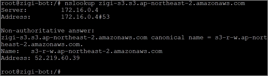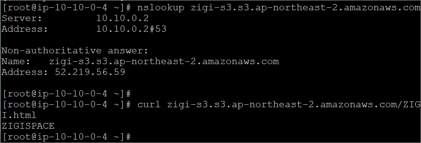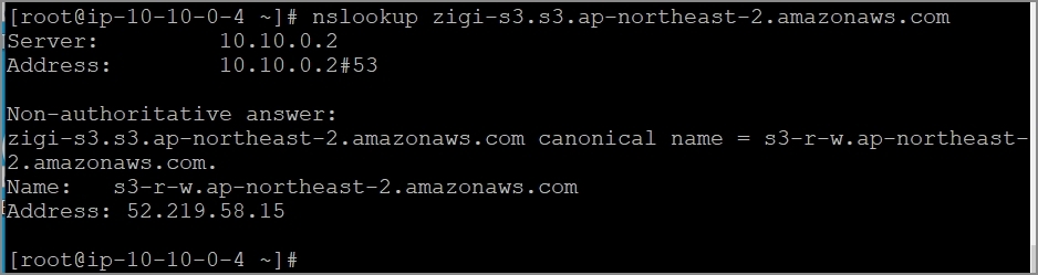 ZIGI-VPC라는 VPC 내부의 ZIGI-SVR(10.10.0.4) 서버에서도 동일하게 S3에 대한 DNS Name 질의 결과를 확인하면 동일하게 S3가 갖고 있는 공인 IP 주소로 응답하는 것을 볼 수 있습니다.