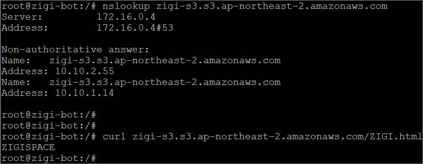 이제 모든 설정이 끝났고, On-Premises의 ZIGI-bot이라는 서버에서 다시 S3에 대한 도메인 질의와 접속 테스트를 해보겠습니다.