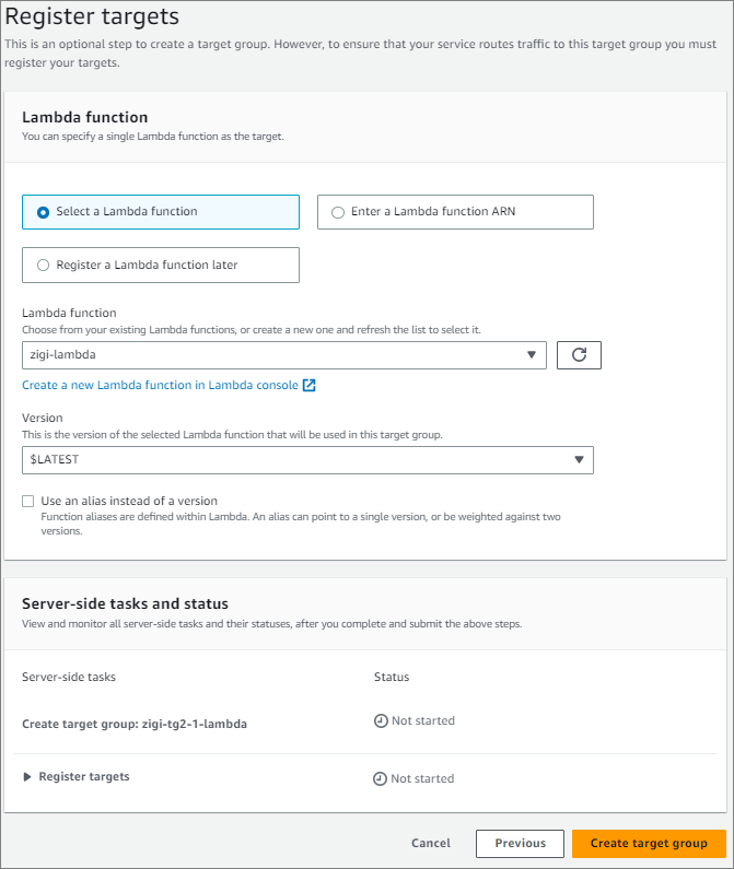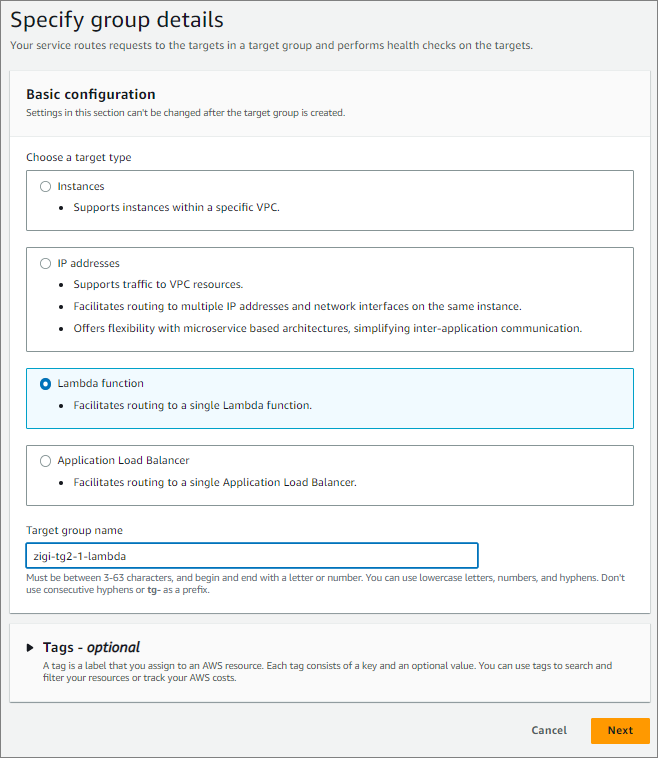 VPC Lattice Service Network를 공유 받은 계정에서 새로운 Target Group을 만들겠습니다. Target Type은 Lambda로 선택하고, target 이름은 zigi-tg2-1-lambda로 설정합니다.