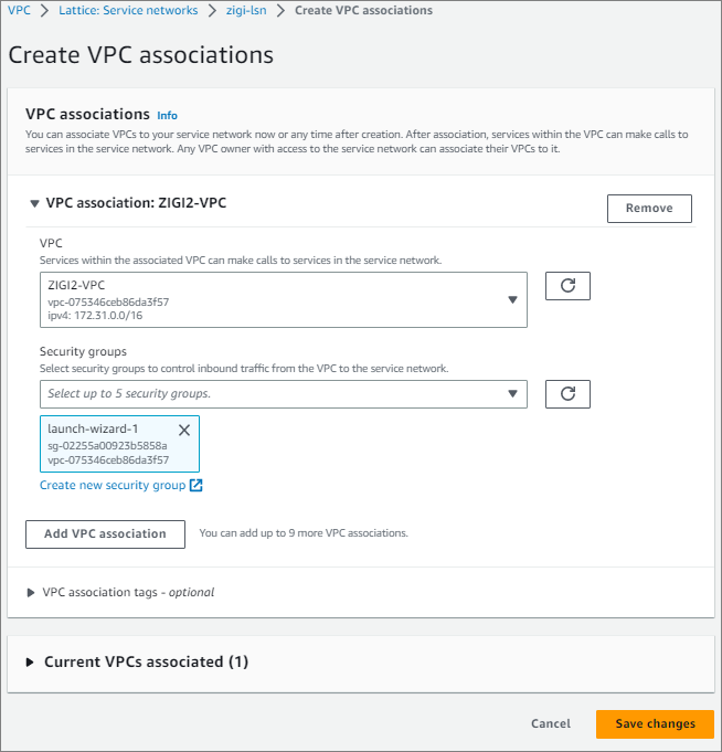 그럼 이제, 공유 받은 계정에서 VPC Lattice Service Network에 선언된 Service에 접근하기 위해서 Service Network에 VPC를 연결 해보겠습니다. 공유 받은 계정의 VPC는 ZIGI2-VPC입니다. VPC와 Security Group을 설정하고 저장합니다.