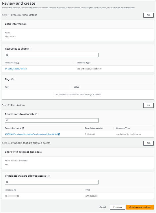 전체 설정된 내용을 확인하고, VPC Lattice Service Network에 대한 자원을 공유합니다.