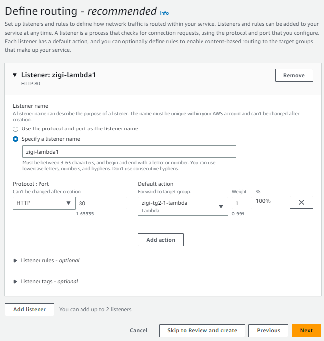 Default action : zigi2-tg2-1-lambda ( 미리 만들어 둔 Lambda function)