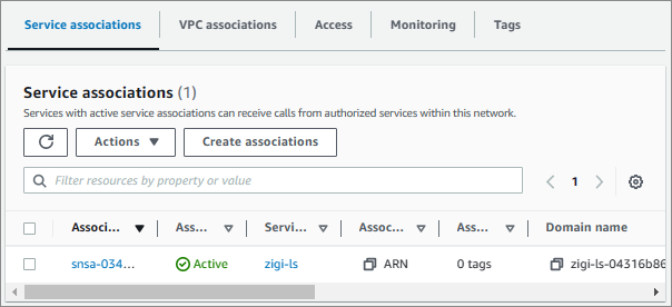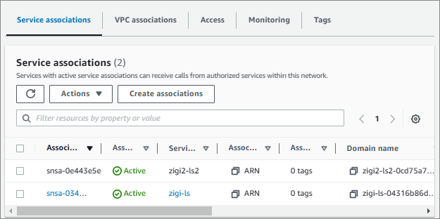VPC Lattice Service Network의 Service associations에서 보면 다음과 같이 Service가 연결된 것을 볼 수 있습니다.