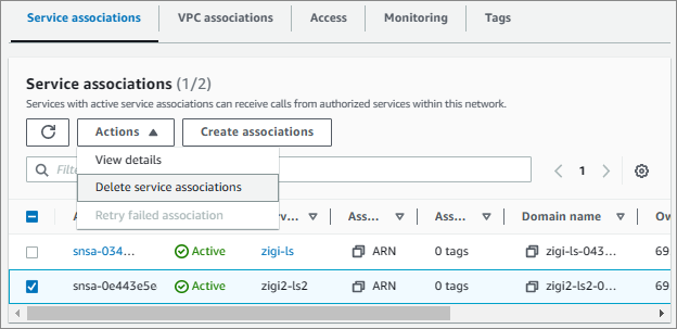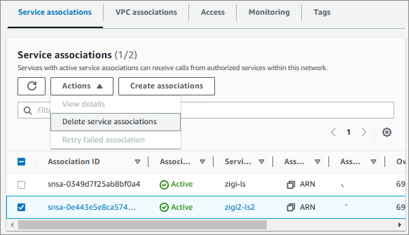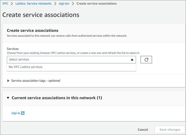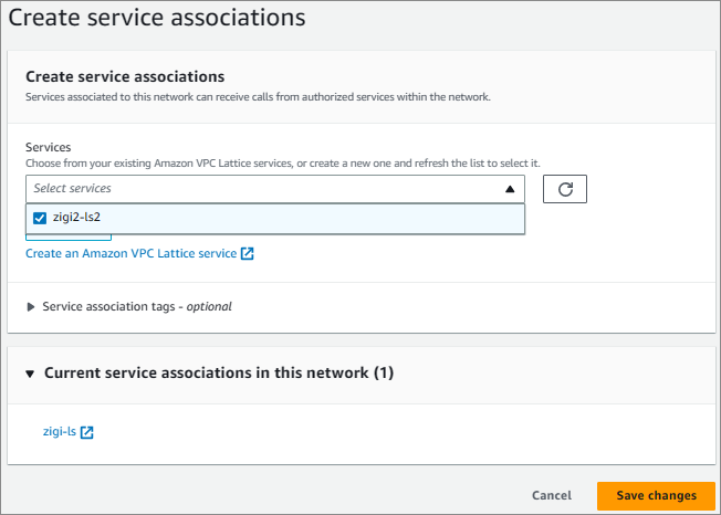 이제 VPC Lattice Service Network Owner 계정(69-72)에서도 zigi2-ls2라는 VPC Lattice Service를 만든 계정의 Service가 확인이 되고, VPC Lattice Service Network에 연결 할 수 있습니다. Save changes를 클릭해서 Service를 연결합니다..