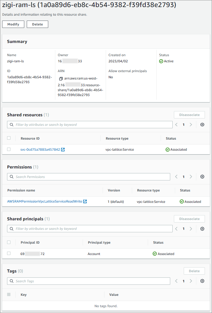 VPC Lattice Service를 공유하기 위한 설정을 다시 한 번 확인하고 공유를 합니다.