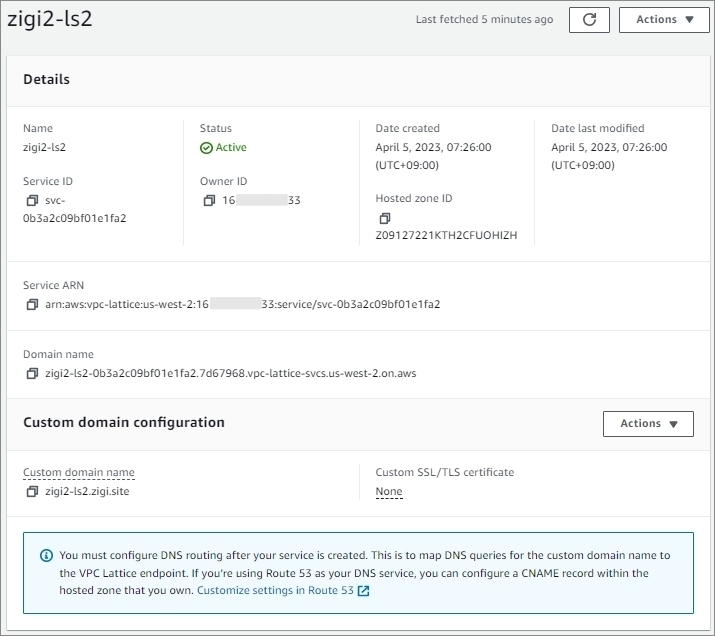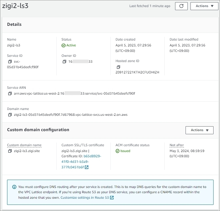 정상적으로 zigi2-ls2가 만들어진 후, zigi2-ls2을 살펴 보면, 기본 VPC Lattice Service 도메인 이외에 하단에 Custom domain 이 zigi2-ls2.zigi.site로 설정된 것 볼 수 있습니다.
