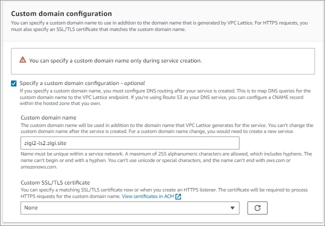 이러한 기본 도메인 이외에, VPC Lattice Service에 대해서 Custom Domain 사용이 가능합니다.