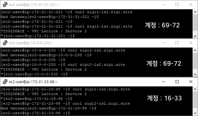 앞선 테스트와 달리, 172.31.31.221, 10.0.0.235 의 Instance에서만 VPC Lattice Service 호출이 성공하고, 기존에 성공하였던 '16-33' 계정의 Instance인 172.31.23.93 Instance는 서비스 호출이 실패한 것을 볼 수 있습니다