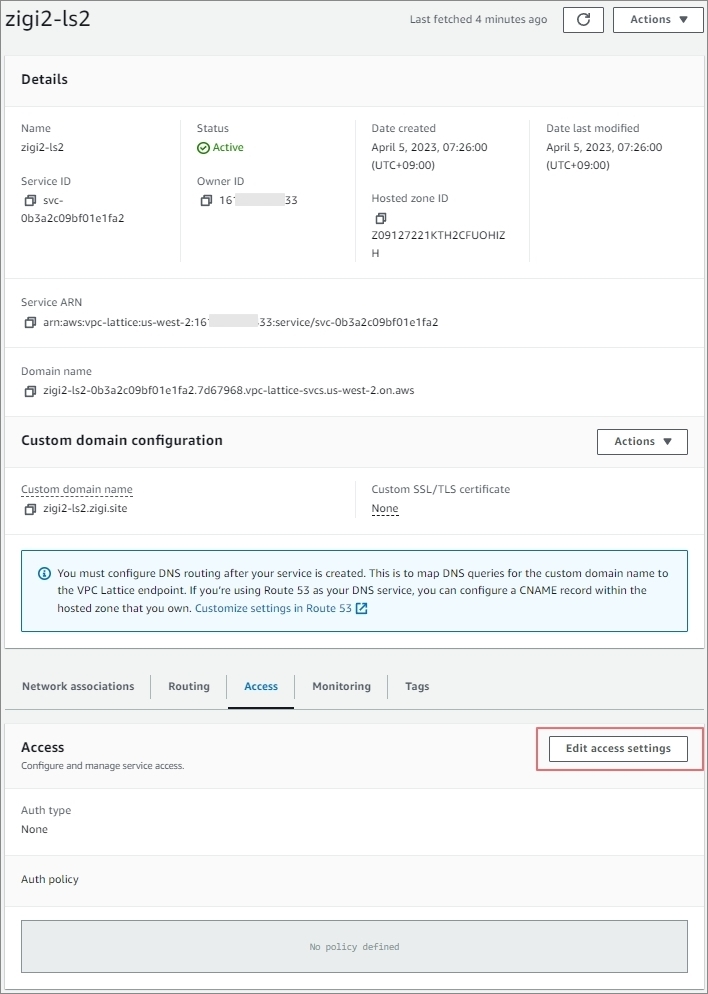 기존에 만든 VPC Lattice Service인 'zigi2-ls2'에는 별도의 Access 정책을 설정하지 않았기 때문에,