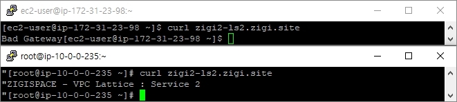 설정 이후에, 다음과 같이 VPC Lattice Service에 접근 시도를 해 봅니다. 기존에 설정한 Access 정책으로 인해서 한 Instance에서는 접근을 실패하고, 다른 한 Instance에서는 접근에 성공했습니다.