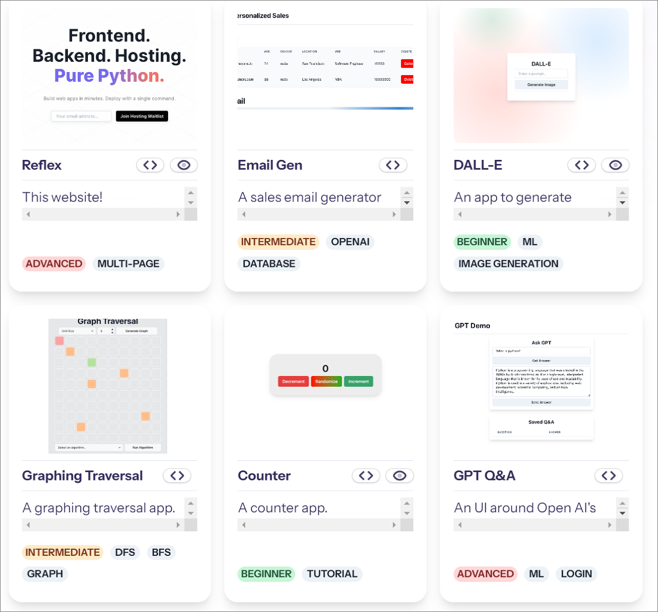 ▪ Reflex를 이용하면 내부 도구와 데이터 앱부터 복잡한 다중 페이지 앱까지 무엇이든 만들 수 있습니다. Reflex의 홈페이지(https://reflex.dev)자체도 Reflex로 만들어졌습니다.