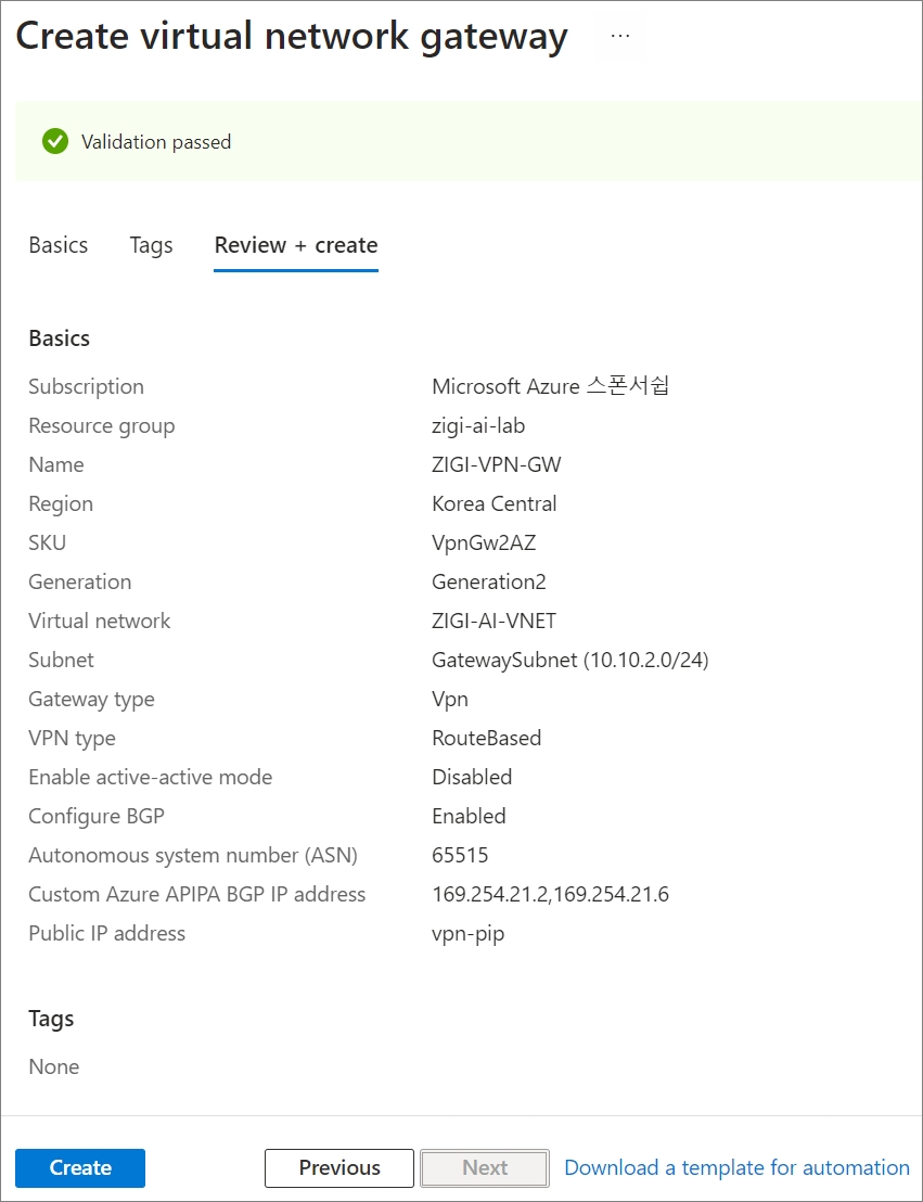 설정한 Virtual Network Gateway 값을 확인 후, 생성합니다.