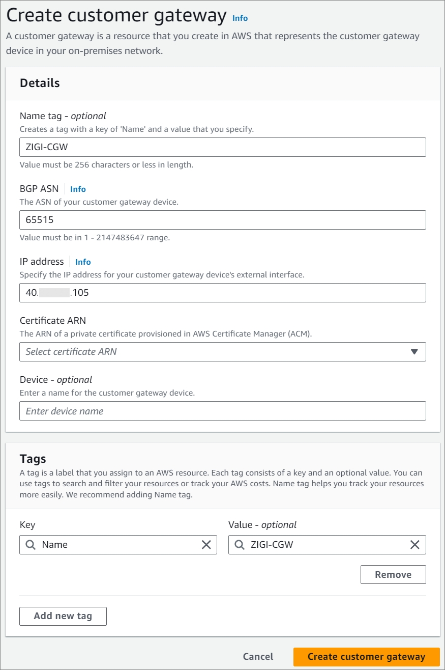 Customer Gateway를 VGW에서 연결하는 것과 동일하게 설정하고, Routing 옵션과 Tunnel option도 동일한 방식으로 설정합니다.