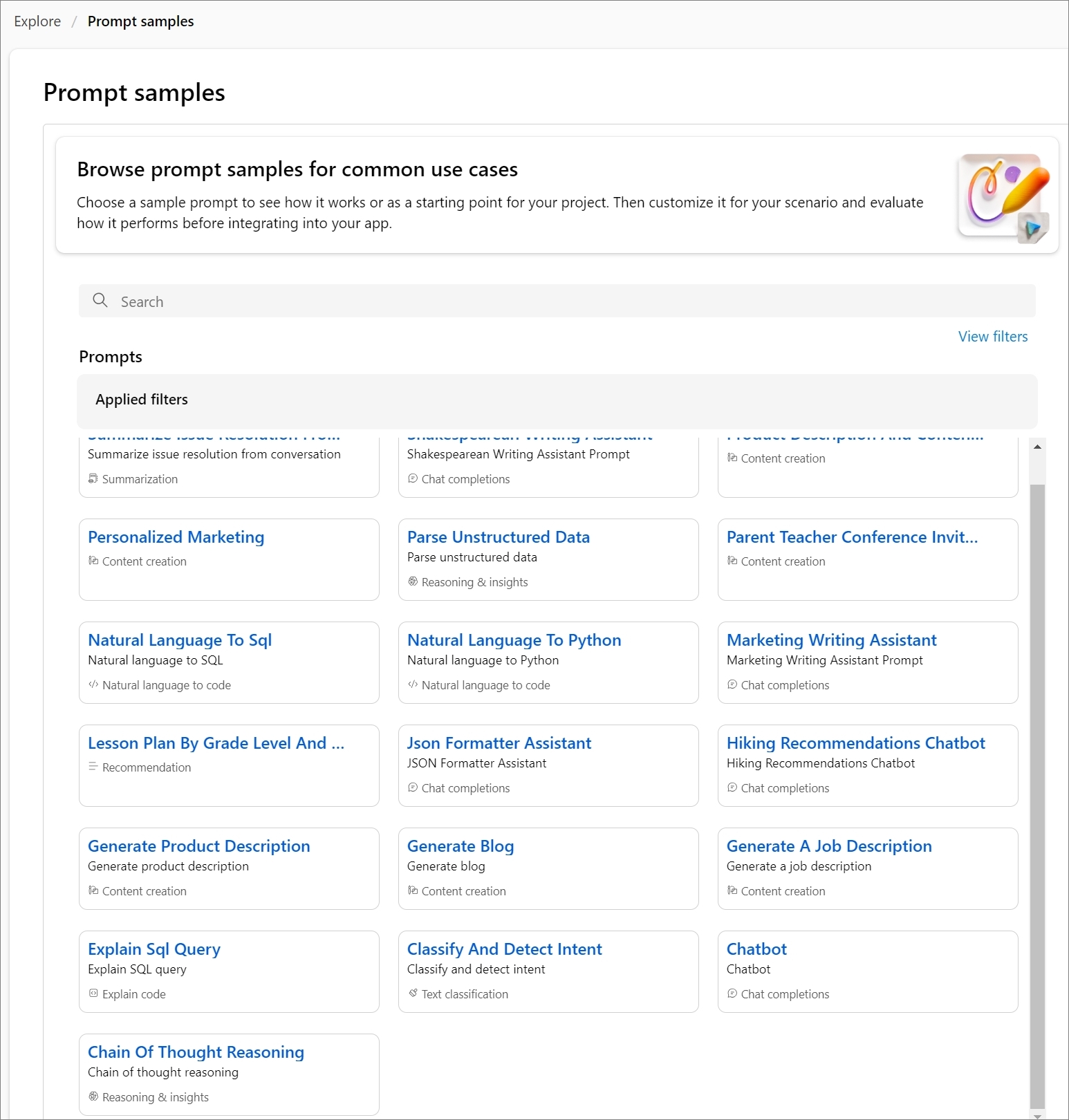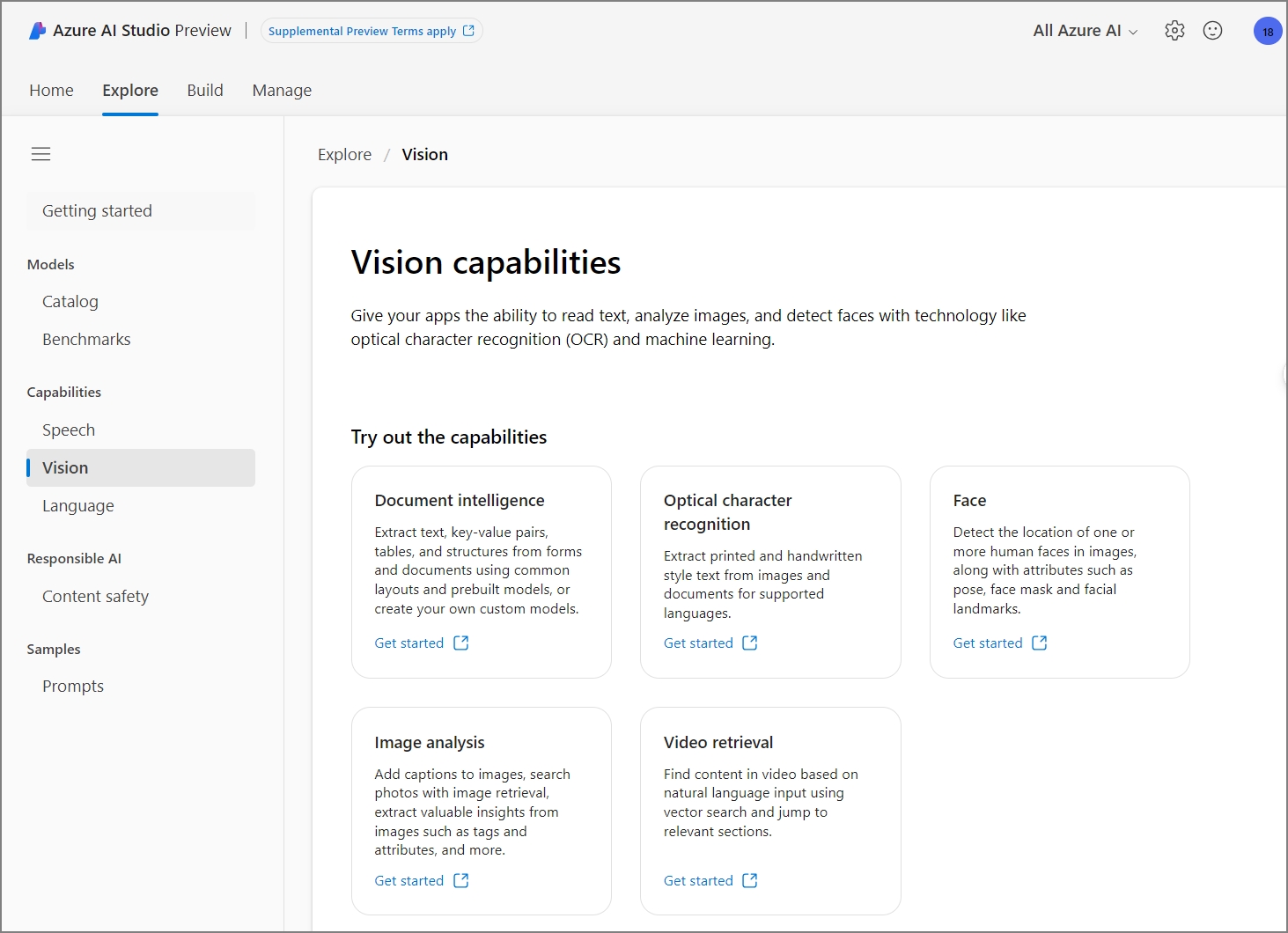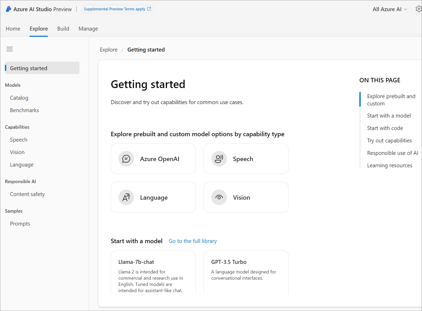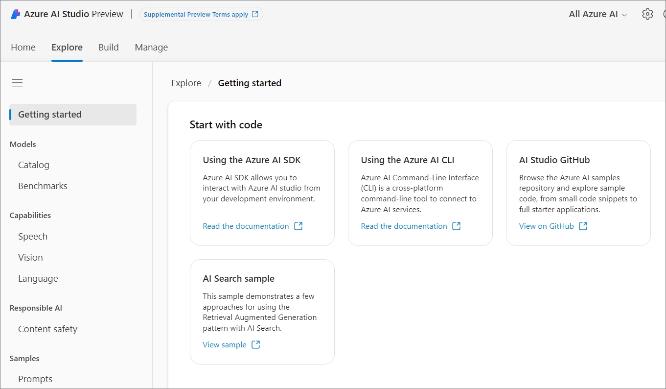 Explorer로 가면, Azure AI Studio에서 제공되는 기능들에 확인 할 수 있는 데,