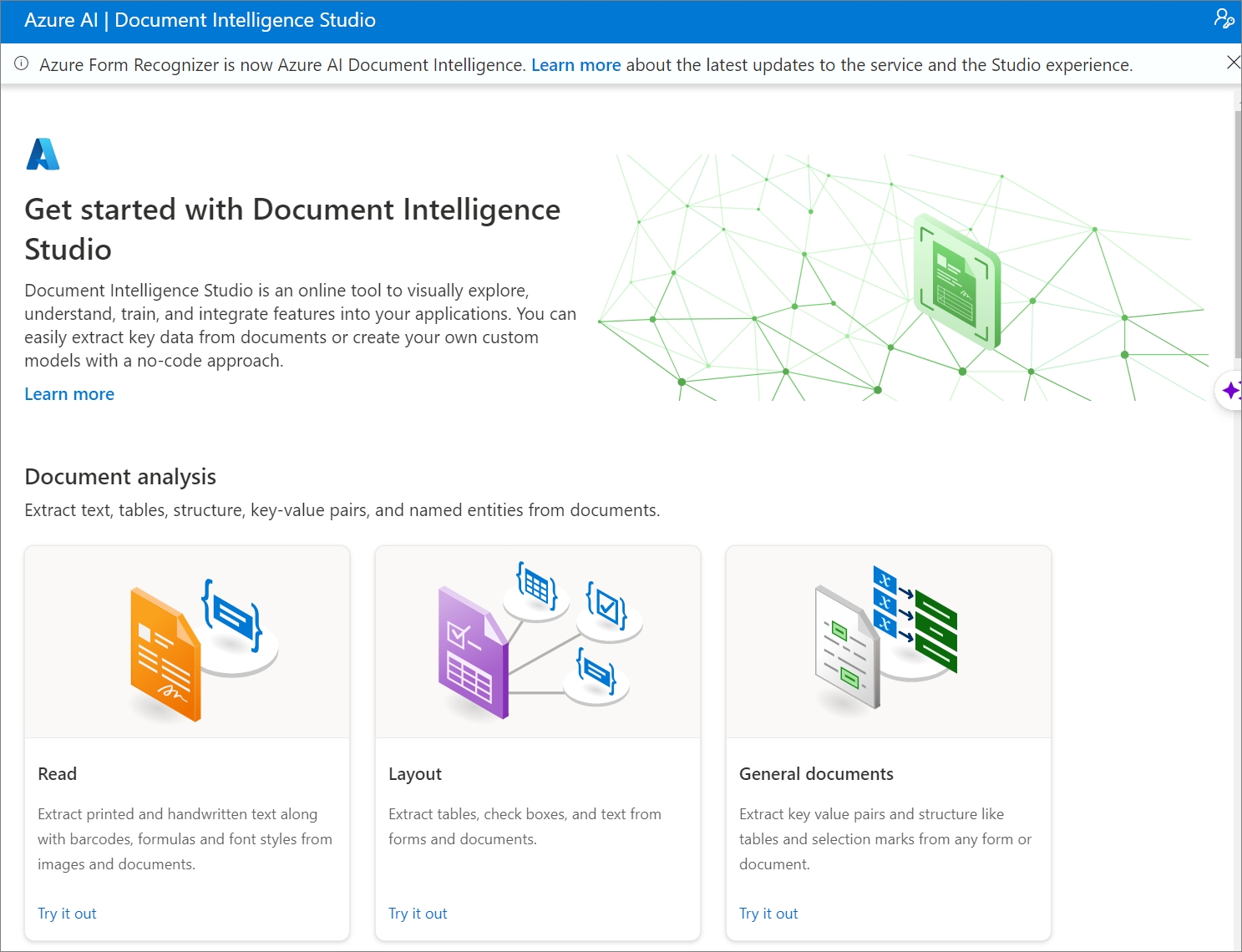 이 중에서 Document intelligence를 선택하면, 아래와 같이 Azure AI Document Intelligence Studio로 연결되는 것을 볼 수 있습니다. (Azure AI Document Intelligence는 기존 Azure Form Recognizer 입니다)