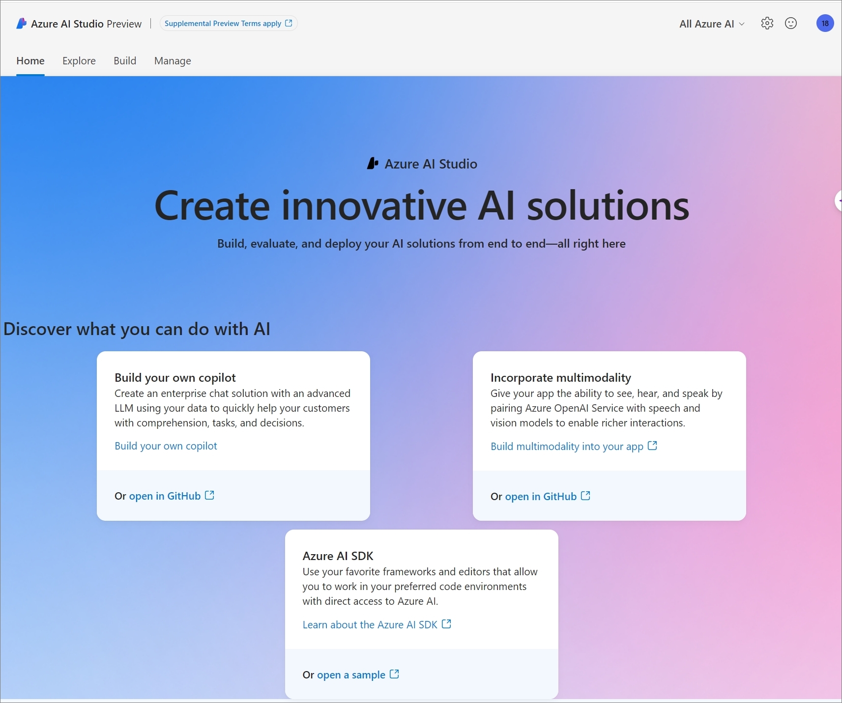 현재 Preview 상태인, Azure AI Studio를 아래와 같이 확인하실 수 있습니다.