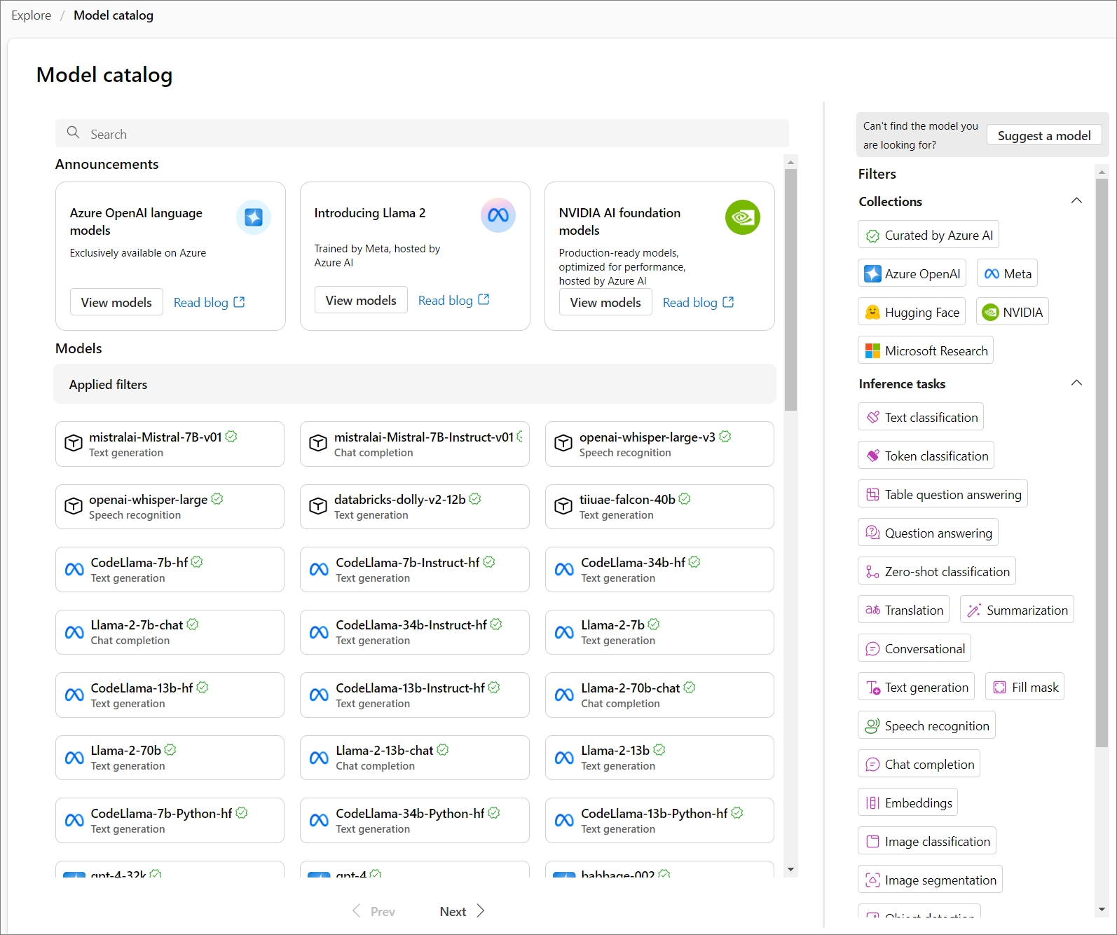 기존에 Azure OpenAI에서 제공되는 모델 이외에도 Meta, Hugging Face, NVIDIA 등에서 제공되는 굉장히 다양한 모델을 선택하여 사용 할 수 있는 것을 볼 수 있습니다.