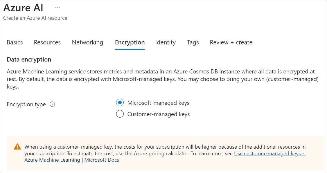 다음은 Azure AI 리소스에서 사용하게 될 데이터의 Encryption 옵션입니다.
