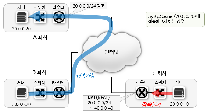 아래 그림의 C 회사처럼 20.0.0.0/24 네트워크로 회사 내부의 사설 IP를 할당한 경우, NAT를 거쳐 공인 IP로 아무리 변환되더라도 실제 인터넷 구간에 존재하는 A 회사의 20.0.0.0/24 네트 워크로는 통신이 불가능합니다. C 회사의 20.0.0.10 서버에서 인터넷에서 서비스하는 A 회사의 20.0.0.20 서버로 접근을 시도할 경우, C 회사의 서버는 A 회사의 서버가 같은 네트워크에 존재 하는 것으로 인식하고 A 회사 서버인 20.0.0.20과 통신하기 위해 브로드캐스트합니다. 실제로 A 회사와 C 회사는 인터넷 구간을 거쳐 통신해야 하므로 원격지와 통신 시도를 서로 인식해야만 정 상적인 통신이 가능하지만 현재 네트워크 구조에서는 같은 네트워크로 인식하므로 정상적인 통신이 불가능합니다