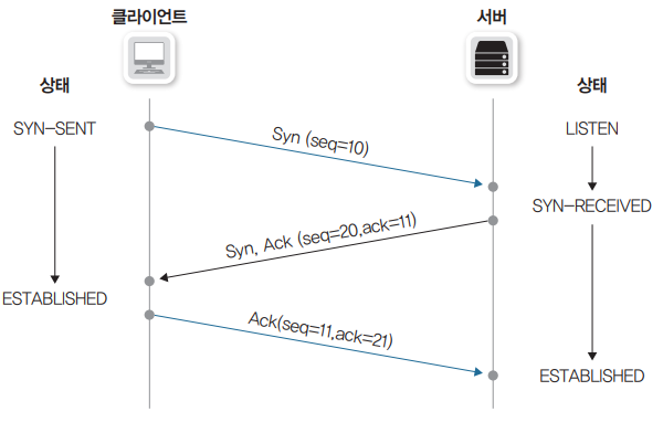 TCP에서는 3번의 패킷을 주고받으면서 통신을 서로 준비하므로 ‘3방향 핸드셰이크’라고 부릅니다.