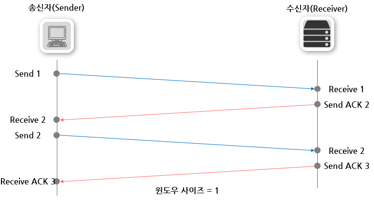 이 숫자를 ACK 번호라고 부릅니다. 송신 측이 1번 패킷을 보냈는데 수신 측이 이 패킷을 잘 받는다면 1번을 잘 받았으니 다음에는 2번을 달라는 표시로 ACK 번호 2를 줍니다.