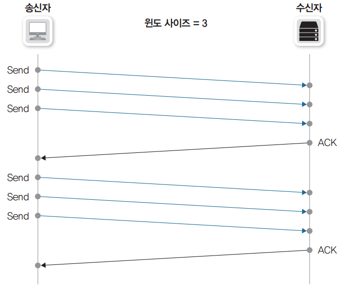 작은 패킷을 하나 보내고 응답을 받아야만 하나를 더 보낼 수 있다면 모든 데이터를 전송하는 데 긴 시간이 걸릴 것 입니다. 그래서 데이터를 보낼 때 패킷을 하나만 보내는 것이 아니라 많은 패킷을 한꺼번에 보내고 응답을 하나만 받습니다. 가능하면 최대한 많은 패킷을 한꺼번에 보내는 것이 효율적이지만 네 트워크 상태가 안 좋으면 패킷 유실 가능성이 커지므로 적절한 송신량을 결정해야 하는데 한 번에 데이터를 받을 수 있는 데이터 크기를 윈도 사이즈라고 하고 네트워크 상황에 따라 이 윈도 사이 즈를 조절하는 것을 슬라이딩 윈도라고 합니다.