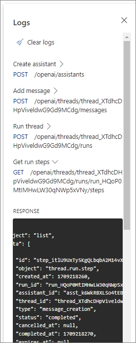 오른쪽의 로그는 Assistant API 작업에 대한 자세한 스냅샷을 보여줍니다.