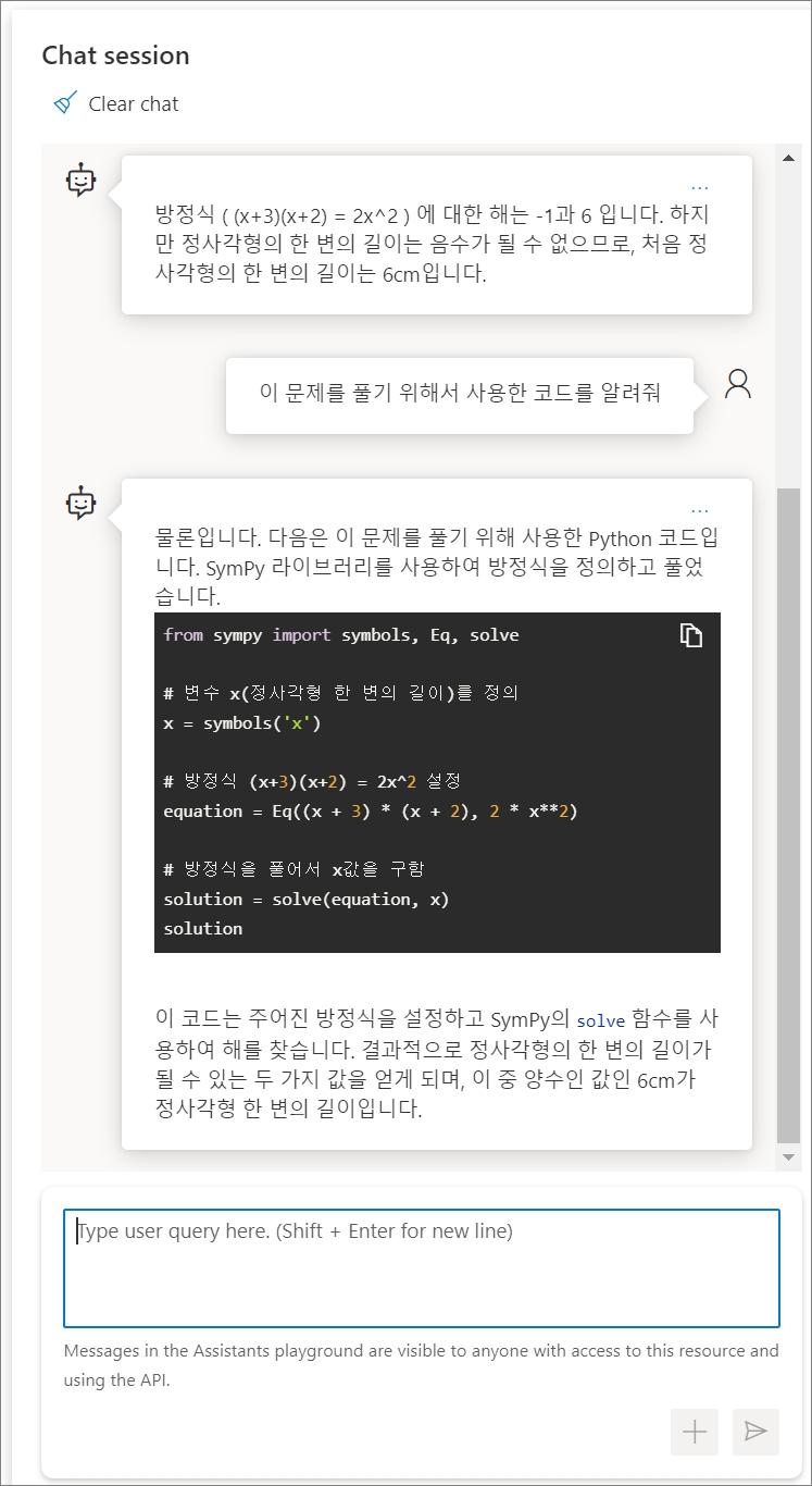 Assistant에서 활성화한 Code Interpreter 기능이 동작하여, 해당 문제를 풀기 위한 코드를 작성하고, 그 코드로 확인한 결과 값을 내용을 토대로 제일 하단과 같이 답변을 하게 됩니다.