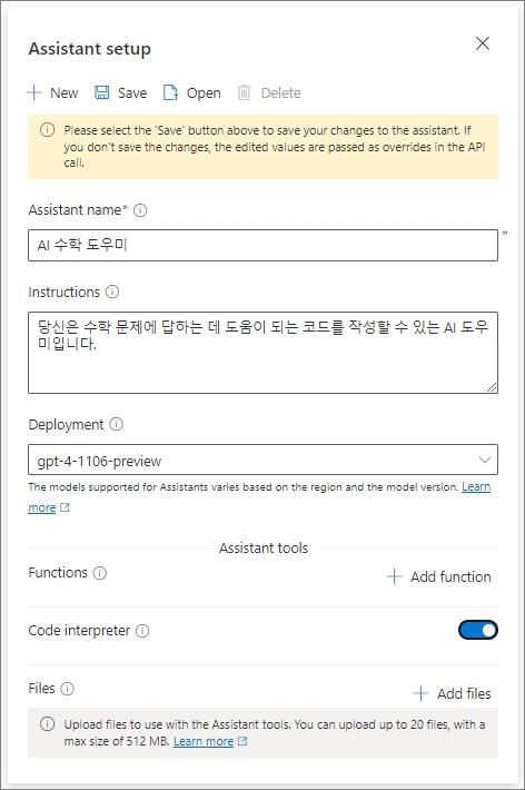 먼저 Assistant 이름은 'AI 수학 도우미'라고 하고,