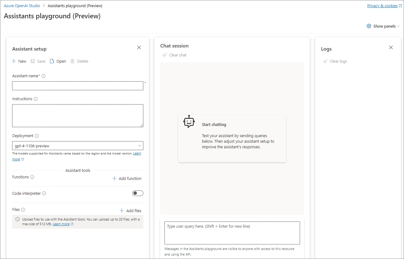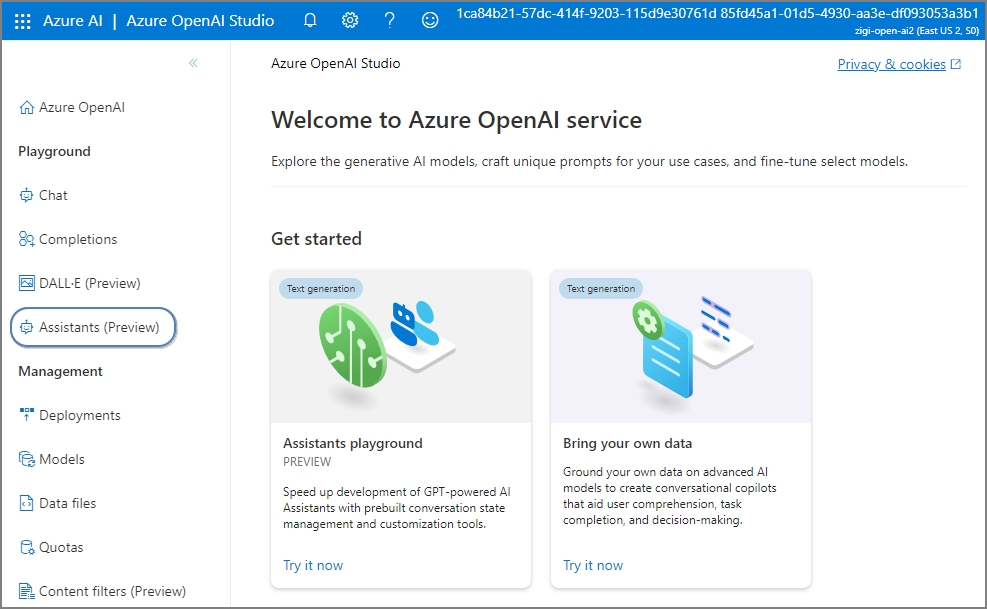 Assistant는 현재(24.03.01) 3개의 리전에서만 Preview로 사용이 가능하기 때문에 Australia East, East US2, Sweden Central이어야 해당 기능을 사용 할 수 있습니다.