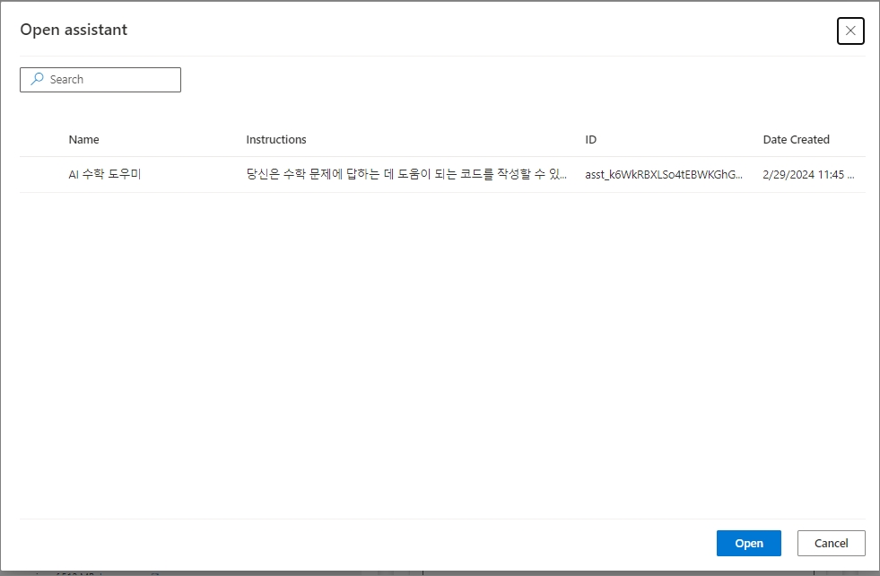 혹은 Open을 눌러서 다음과 같이 기존에 만들어 둔, Assistant를 불러와서 사용도 가능합니다.