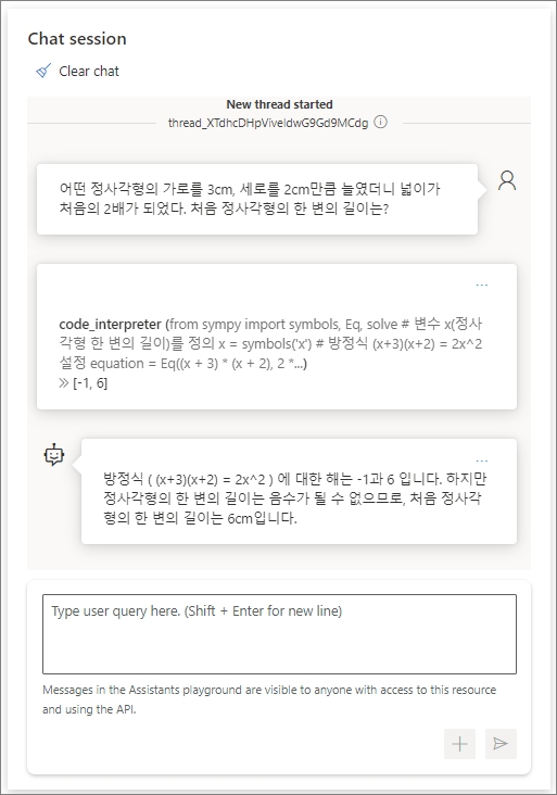 가운데에서는 설정한 Assistants로 Chat세션으로, Assistants API에서는 Thread라고 합니다.