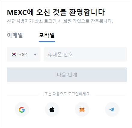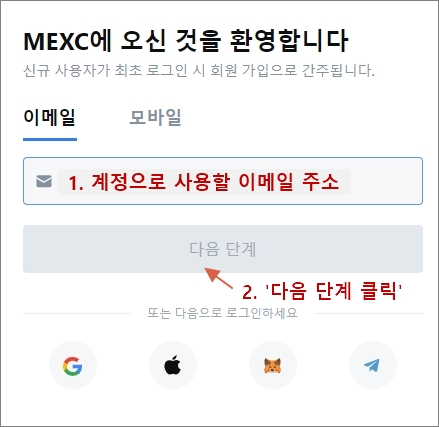 MEXC 거래소 접속 계정은 이메일 주소 혹은 모바일 모두 가능합니다.