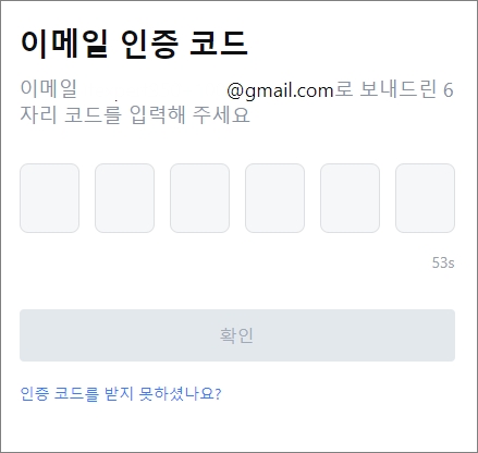 아래와 같이 이메일 인증코드 6자리를 입력하도록 화면이 뜹니다.
