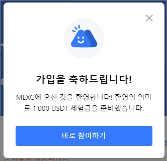 가입 축하 화면을 보시면 최대 1,000 USDT 체험금을 제공도 합니다.