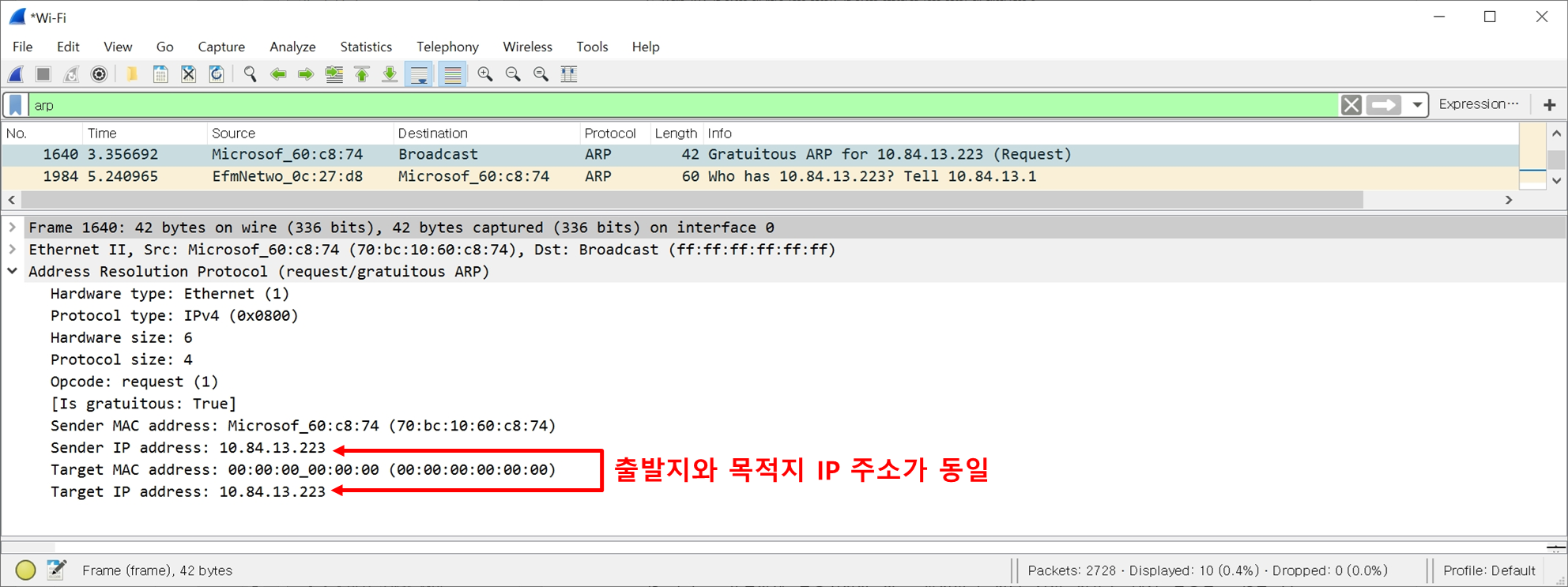 다른 ARP 요청과 같은 점은 대상자 MAC 주소가 00:00:00:00:00:00으로 채워진 것이고 다른 점은 송신자와 대상자 IP 주소가 자신으로 동일하다는 것입니다.