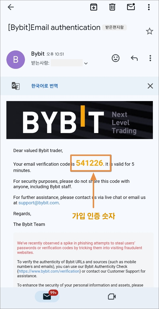 이메일에서 [Bybit] Email authentiction 메일을 보면,