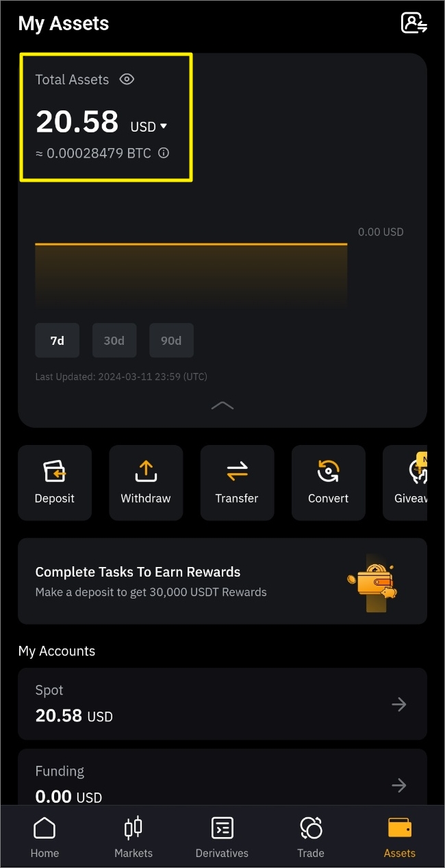 바이비트 앱에서, 우측 하단의 'Assets'을 선택하여