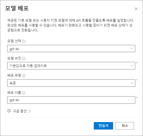 배포된 모델을 사용 할 때 쓰는 배포 이름을 지정하는 데, 모델명과 동일하게 gpt-4o로 하겠습니다.