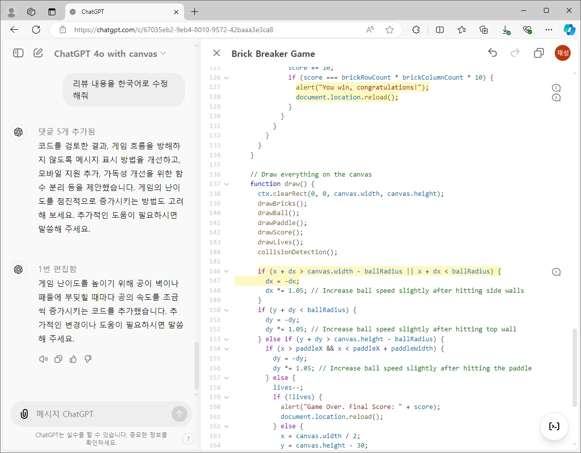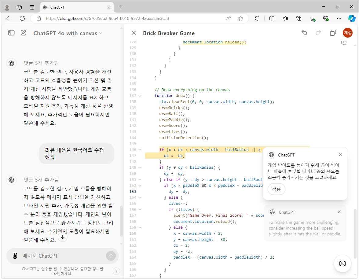 앞에서 보셨을지 모르겠지만, 각각의 canvas 기능을 실행하면 좌측의 프롬프트 창에서 ChatGPT가 수행한 내용에 대한 내용에 대한 답변으로 보내게 됩니다.