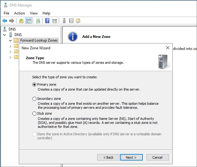 Master 서버에서는 Zone 생성 시, Zone Type을 'Primary zone'으로 설정합니다.