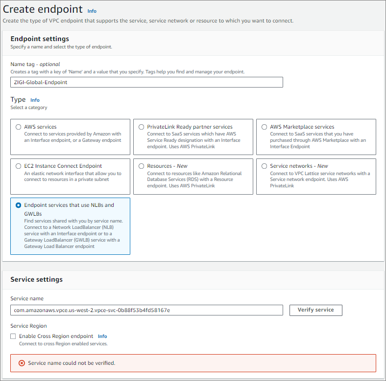 하단에 Service settings에서, Endpoint Service의 이름을 입력하고 'verify service'를 클릭합니다.