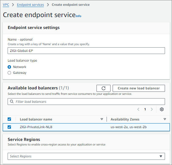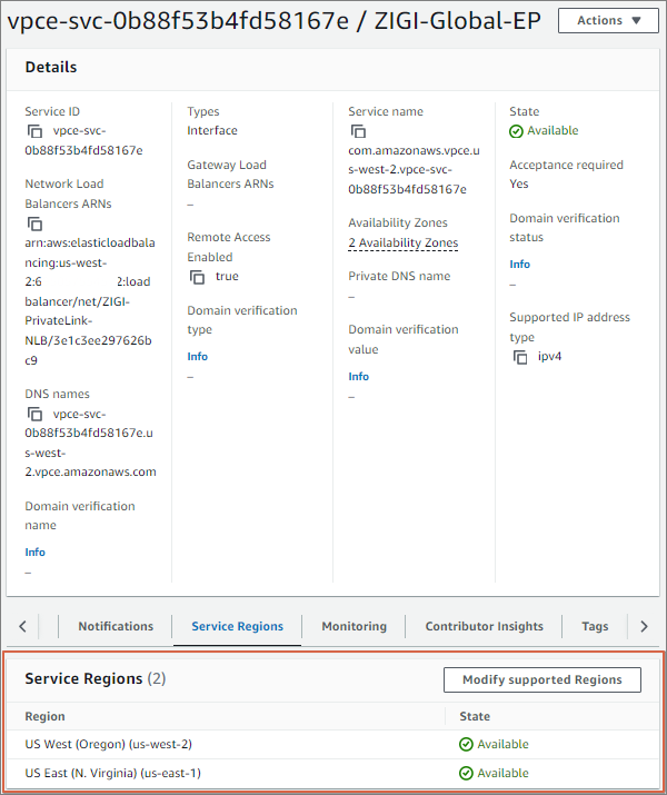 Endpoint Service를 생성한 us-west-2와 생성 시에 설정한 us-east-1이 설정된 것을 볼 수 있습니다.