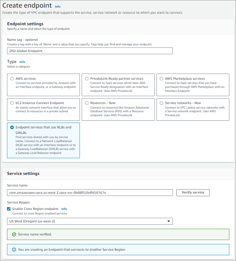 'Enable Cross Region endpoint' 속성을 체크하고 난 이후에 다시 verify serice를 하면
