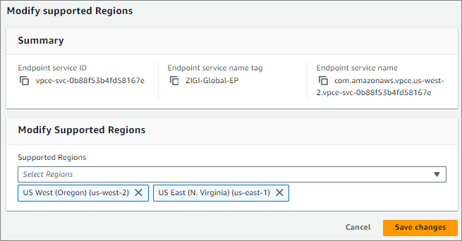Endpoint Service를 생성한 us-west-2와 생성 시에 설정한 us-east-1이 설정된 것을 볼 수 있습니다.