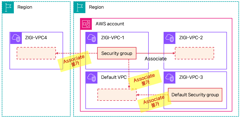 - 기본 보안 그룹을 다른 VPC와 연결하거나 보안 그룹을 기본 VPC와 연결할 수 없습니다.