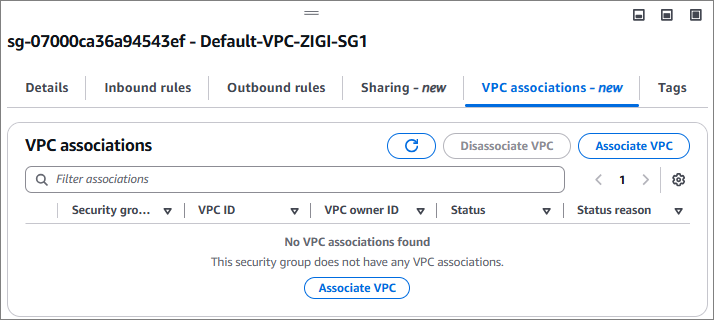 Security Group을 공유한 VPC의 Security Group에서 'VPC Associations' 탭으로 들어갑니다.