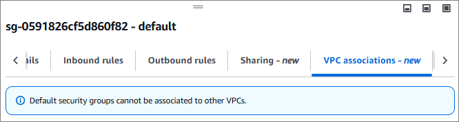 - 기본 보안 그룹을 다른 VPC와 연결하거나 보안 그룹을 기본 VPC와 연결할 수 없습니다.